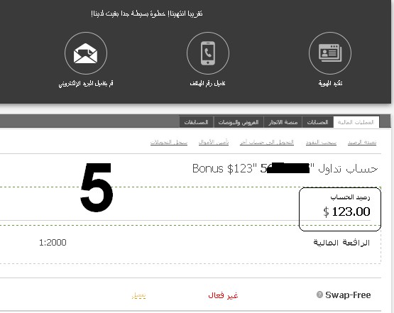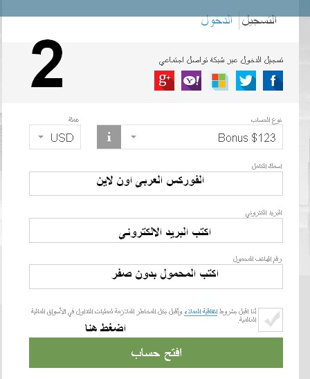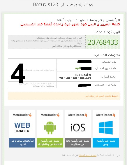 كيفية تسجيل حساب بونص 123 دولار للحصول على بونص 123 دولار من شركة الفوركس الرائعة FBS كل ماعليك فعله هو التركيز فقط 5 دقائق فى الشرح ويفضل استخدام متصفح جوجل كروم او متصفح فاير فوكس اثناء تسجيل حساب بونص 123 دولار فى الشركة والدخول الى الشركة من هذا الرابط اضغط على الرابط واحصل على بونص 123$ بدون ايداع بعد الدخول الى الصفحة الرئيسية فى شركة FBS ستجد دائرة بونص 123 دولار واسفلها كلمة افتح حساب بونص 123 وقد قمت انا بوضع الكلمة فى مستطيل يظهر لك وفوقها كلمة اضغط هنا كما هو موضح فى الصورة التالية رقم 1 فقم بالضغط على هذا الرابط بعد الضغط على الرابط يحولك مباشرة الى صفحة تسجيل حساب 123 دولار بدون ايداع فى شركة FBS فقم بكتابة البيانات الصحيحة الخاصة بك باللغة الانجليزية وليست باللغة العربية وهى الاسم كاملا ثم البريد الالكتروني ثم رقم الهاتف ويظهر لك كود الدولة تلقائى فاكتب الهاتف المحمول بدون رقم 0 اذا كنت من مصر ثم وافق على الشروط واخيرا اضغط على كلمة افتح حساب كما هو موضح فى الصورة التالية رقم 2 تظهر لك صفحة بها كلمة المرور المؤقتة فان كنت ترغب فى تغيرها وهذا هو الافضل فقم بتغيرها ثم اضغط على كلمة تغير كلمة المرور وان كنت لا تريد تغيرها اضغط على علامة X اعلى الصفحة كما هو موضح فى الصورة التالية رقم 3 تظهر لك بعد ذلك بيانات الحساب كاملا مثل البن كود وهو الذى سوف تكتبه عند سحب الاموال او الايداع ورقم الحساب وكلمة مرور الحساب ومخدم التداول وكلمة مرور المستثمر فقم بحفظ هذا كله فى اجندة او ورقة خارجية للاستعانه به واشدد على ان لا تحفظه على جهاز الحاسب كما هو موضح فى الصورة التالية رقم 4 وفى اسفل الصفحة وستجد برنامج الميتاتريدر للتحميل والمتوافق مع الاجهزة الذكية والمحمول والكمبيوتر المكتب فحمل ماتريد منها وما يناسب طريقة تداولك واذا كنت تريد الانتقال الى صفحة الحساب فاضغط على كلمة الانتقال الى صفحة الحساب الموجود فى المستطيل الموضح لك وقد كتبت عليها كلمة اضغط هنا كما هو موضح امامك فى الصورة التالية رقم 4 انت الان فى صفحة حسابك الشخصى وستجد ان بعد تسجيل حساب بونص 123 دولار بدون ايداع فى شركة FBS قد تم الايداع فورا فى حسابك مبلغ 123 دولار فعليا وهذا هو رصيد حسابك كما هو موضح فى الصورة التالية رقم 6 وبذلك مبروك عليك تسجيل حساب بونص 123 دولار فى شركة FBS انضم لاكثر من مليون و250 الف متداول مع اقوى شركات الفوركس انضم الى شركة FBS واحصل على بونص 123$ بدون ايداع |